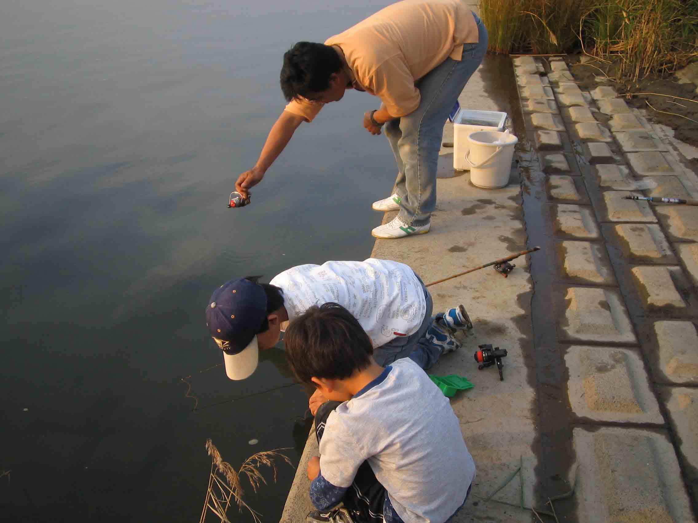 - ハゼ釣りが好調のようなので、家族で立田橋近くへ。10時過ぎに現場到着すると、ちょうど干潮を迎えた頃。ちょい投げでぽつりぽつりと釣れるが、忙しい程ではない。下の子がザリガニがいるよ〜と言うのを、そんなことはないよ、と聞き流していたが。。。昼を過ぎて、だんだん潮が満ちてくると、ハゼも浅瀬にあがってきて、見釣りでハゼが釣れるようになる。よくよく見てみると、ハゼとドンコに混ざって、石の間からハサミを出してくるのがいる。あれ、手長エビ?? 下の子がザリガニと見間違えたようだ。長いハサミを出してきて、えさのイソメを挟んでくる。はさんだところを釣り上げようとするが、いいところでハサミを離してしまう。何回かやっているうちに、ようやく1尾を釣り上げることができた。ハサミを入れると10cmをこえるサイズ。空揚げにすると美味しそう。しかし、だんだん潮が満ちてきて、小さなブロック護岸にいられなくなる。下の子がどうしても釣りたくて靴が濡れだしても釣ろうとしている。ここは諦めて、コンクリート護岸にあがってみると、護岸の下からエビが覗いている。これを狙って、大小10尾ほど釣り上げた。家にかえり、大物は昆虫用の小さな水槽に入れ、小物は金魚を買っている水槽に入れた。1〜2日すると、金魚に異変が。。。デメキンのヒレが無くなっている!? 2〜3cmほどの手長エビにやられたようだ。結局、水槽を入れ替えたが、数日後に小エビは全滅。大きなエビは長生きしている(12月17日現在)。釣り具屋でワカサギ釣り用の赤虫を購入して、金魚と熱帯魚にあげるついでに、手長エビにも与えている。